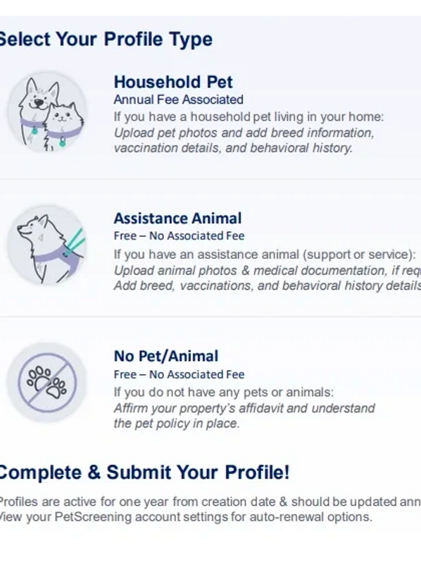 Please click below to complete the pet screen process. This is required with the Rental Applications, even if you do not have pets. Subject to application fees.